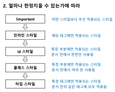 - 스타일 규칙의 중요도와 적용 범위에 따라 우선순위가 결정되고 그 우선순위에 따라 위에서 아래로 스타일 적용