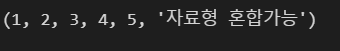 tup = (1,2,3,4,5,"자료형 혼합가능")