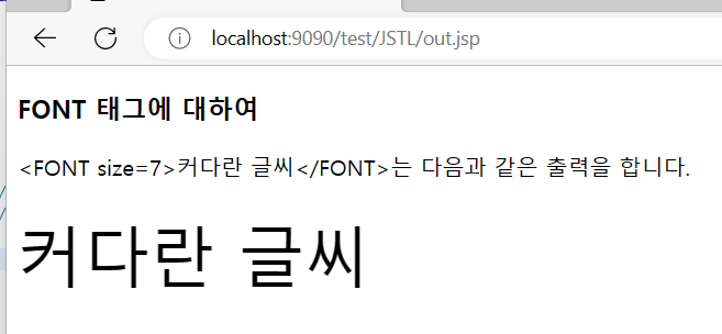 <c:out value="<FONT size=7>커다란 글씨</FONT>는 다음과 같은 출력을 합니다." /><br><br>