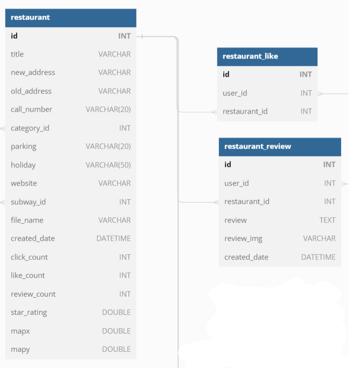 테이블의 구조는 위와 같다. 사용자가 resaturant_review 테이블에 Insert, delete 할 때 Restaurant 테이블에 있는 review_count를 증감시키는 과정이 필요했다. (like도 동일하다)